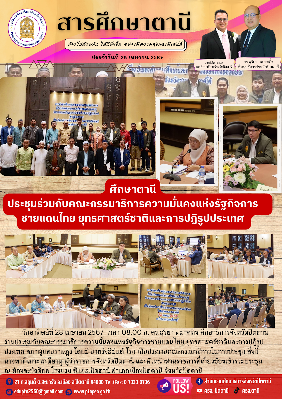 ศึกษาตานี ประชุมร่วมกับคณะกรรมาธิการความมั่นคงแห่งรัฐกิจการชายแดนไทย ยุทธศาสตร์ชาติและการปฏิรูปประเทศ กิจกรรมผู้บริหาร 28 เม.ย. 2567 370 share tweet share