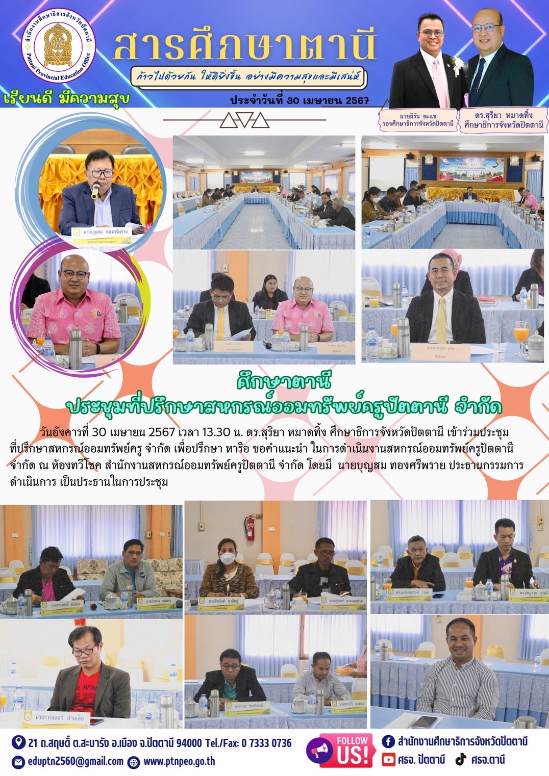 ศึกษาตานีประชุมที่ปรึกษาสหกรณ์ออมทรัพย์ครูปัตตานี จำกัด กิจกรรมผู้บริหาร 30 เม.ย. 2567 347 share tweet share