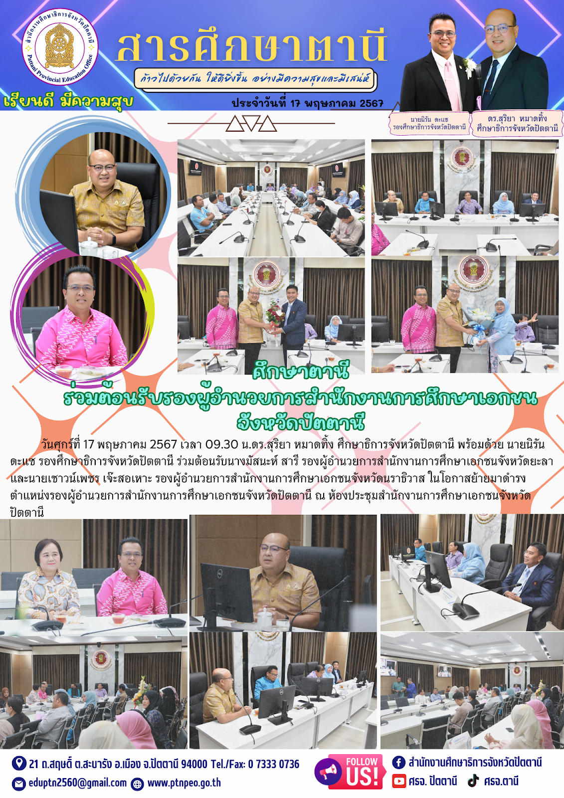 ศึกษาตานีร่วมต้อนรับรองผู้อำนวยการสำนักงานการศึกษาเอกชนจังหวัดปัตตานี กิจกรรมผู้บริหาร 17 พ.ค. 2024 335 share tweet share