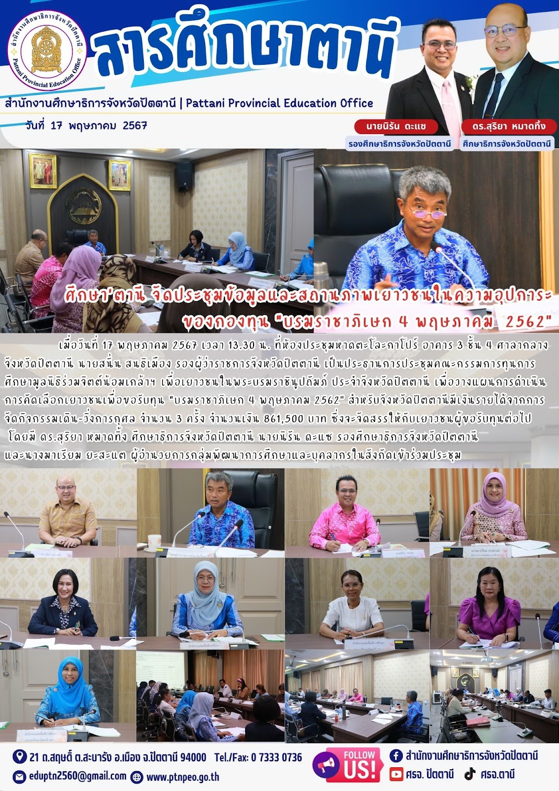 ศึกษา’ตานี จัดประชุมข้อมูลและสถานภาพเยาวชนในความอุปการะของกองทุน “บรมราชาภิเษก 4 พฤษภาคม 2562” กิจกรรมผู้บริหาร 17 พ.ค. 2567 300 share tweet share