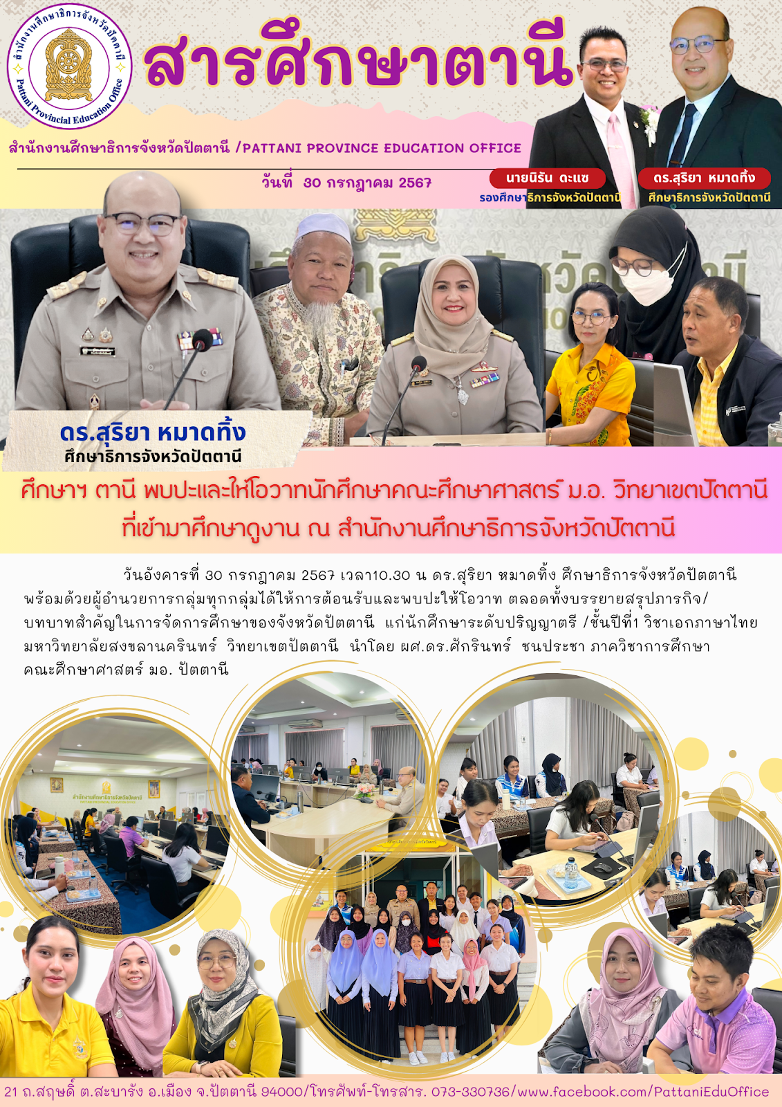 ศึกษาฯ ตานี พบปะและให้โอวาทนักศึกษาคณะศึกษาศาสตร์ ม.อ. วิทยาเขตปัตตานี ที่เข้ามาศึกษาดูงาน ณ สำนักงานศึกษาธิการจังหวัดปัตตานี กิจกรรมผู้บริหาร 30 ก.ค. 2567 465 share tweet share