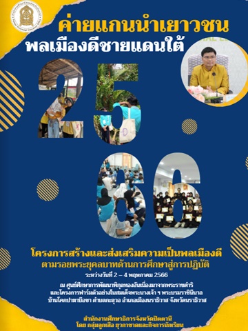 E-book ค่ายแกนนำเยาวชนพลเมืองดีชายแดนใต้ โครงการสร้างและส่งเสริมความเป็นพลเมืองดี ตามรอยพระยุคลบาทด้านการศึกษาสู่การปฏิบัติ ระหว่างวันที่ 2 - 4 พฤษภาคม 2566 ณ ศูนย์ศึกษาการพัฒนาพิกุลทอง อันเนื่องมาจากพระราชดำริและโครงการฟาร์มตัวอย่างในสมเด็จพระนางเจ้า ฯ พระบรมราชินีนาถ บ้านโคกป่าฆาบืออชา ตำบลกะลุวอ อำเภอเมืองนราธิวาส จังหวัดนราธิวาส