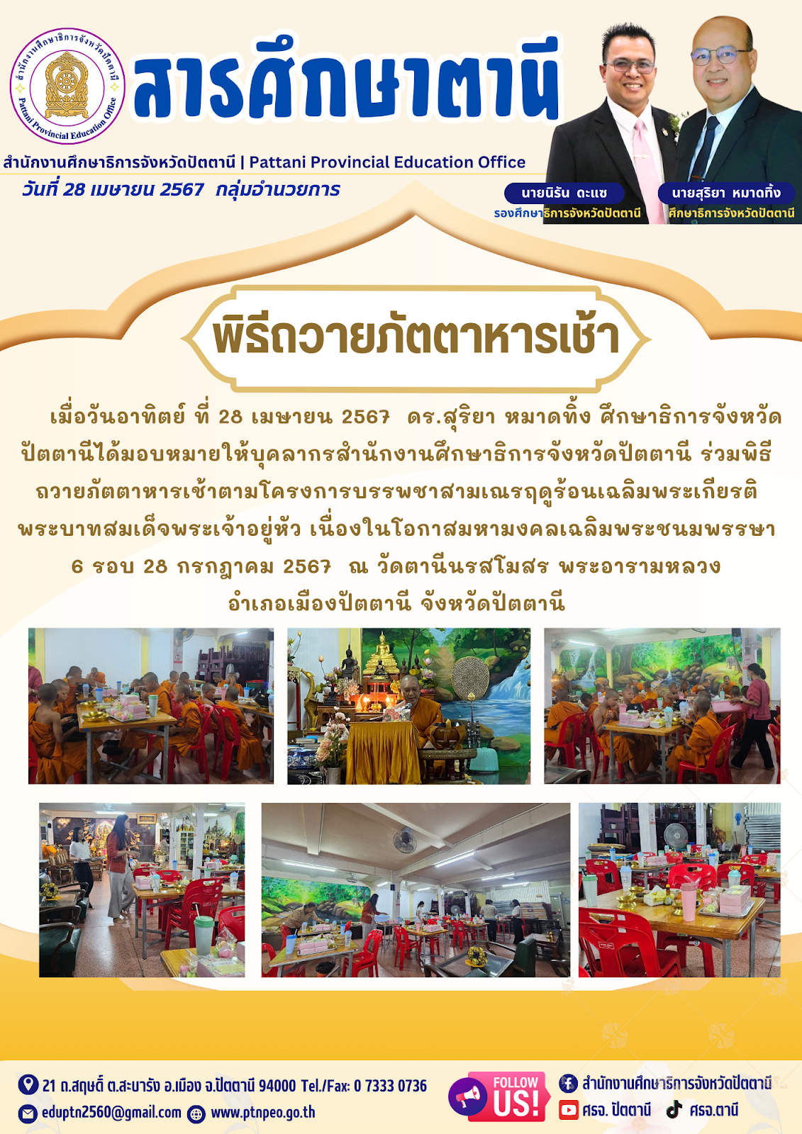 ร่วมถวายภัตตาหารเช้าตามโครงการบรรพชาสามเณรฤดูร้อนเฉลิมพระเกียรติ พระบาทสมเด็จพระเจ้าอยู่หัว เนื่องในโอกาสมหามงคลเฉลิมพระชนมพรรษา 6 รอบ ข่าวกิจกรรมกลุ่มงาน 30 เม.ย. 2567 357 share tweet share tags: กลุ่มอำนวยการ QR Code หน้านี้ : เรื่องที่เกี่ยวข้อง ข่าวจัดซื้อจัดจ้าง เผยแพร่แผนการจัดซื้อจัดจ้าง ประจำปีงบประมาณ พ.ศ.2569 ข่าวจัดซื้อจัดจ้าง เผยแพร่แผนการจัดซื้อจัดจ้าง โครงการปรับปรุงหอประชุมเสมาตานี ประจำปีงบประมาณ พ.ศ. 2569 ข่าวกิจกรรมกลุ่มงาน รายงานงบทดลองหน่วยเบิกจ่าย ประจำเดือน กันยายน 2568 ข่าวกิจกรรมกลุ่มงาน รายงานงบทดลองหน่วยเบิกจ่าย ประจำเดือน สิงหาคม 2568 ข่าวกิจกรรมกลุ่มงาน รายงานงบทดลองหน่วยเบิกจ่าย ประจำเดือน กรกฎาคม 2568 ข่าวกิจกรรมกลุ่มงาน รายงานงบทดลองหน่วยเบิกจ่าย ประจำเดือน มิถุนายน 2568