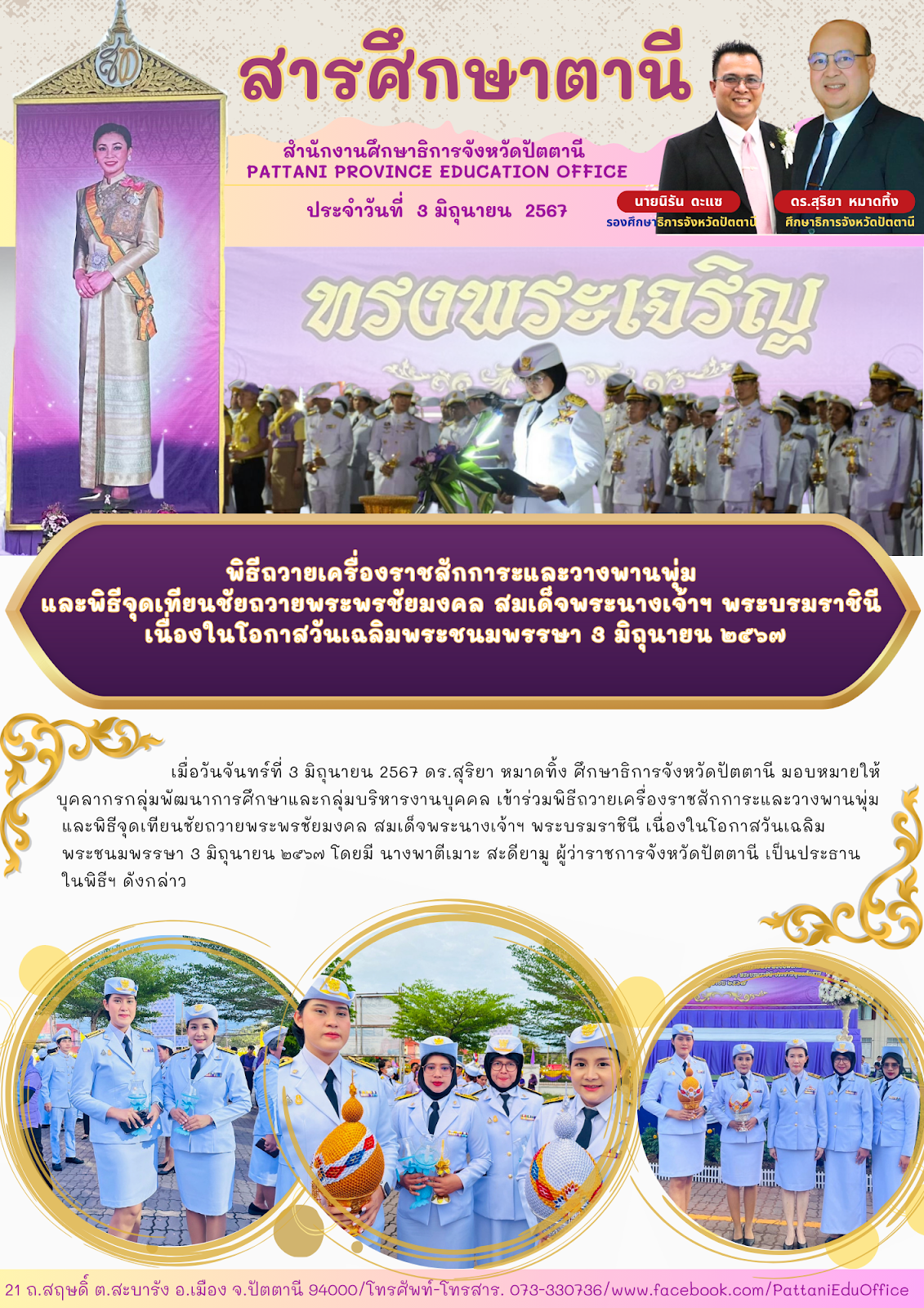 พิธีถวายเครื่องราชสักการะและวางพานพุ่มและพิธีจุดเทียนชัยถวายพระพรชัยมงคล สมเด็จพระนางเจ้าฯ พระบรมราชินีเนื่องในโอกาสวันเฉลิมพระชนมพรรษา 3 มิถุนายน 2567 ข่าวกิจกรรมกลุ่มงาน 04 มิ.ย. 2567 438 share tweet share tags: กลุ่มบริหารงานบุคคลกลุ่มพัฒนาการศึกษา QR Code หน้านี้ : เรื่องที่เกี่ยวข้อง ข่าวประชาสัมพันธ์ โครงการครูแนะแนวเพื่อนใจ: เสริมพลังครู สร้างภูมิคุ้มกันใจให้เด็กตานี ปีที่ 2 ข่าวประกาศ/คำสั่ง นโยบายการบริหารและพัฒนาทรัพยากรบุคคล สำนักงานศึกษาธิการจังหวัดปัตตานีประจำปีงบประมาณ พ.ศ. 2569 ข่าวประกาศ/คำสั่ง การคัดเลือกบุคคลผู้สมควรได้รับรางวัล “ครูดี ศักดิ์ศรีแห่งปัตตานี” ประจำปี พ.ศ. 2569 ข่าวกิจกรรมกลุ่มงาน พิธีมอบรางวัลเชิดชูเกียรติผู้ชนะ การประกวดคลิปสั้น ระดับจังหวัด ภายใต้แนวคิด “Hug Your Dream; Light Up Your Life.” เอกสารเผยแพร่ รายงานผลการดำเนินการเพื่อส่งเสริมคุณธรรมและความโปร่งใสภายในหน่วยงาน เอกสารเผยแพร่ รายงานผลการบริหารและพัฒนาทรัพยากรบุคคล ปีงบประมาณ พ.ศ. 2567
