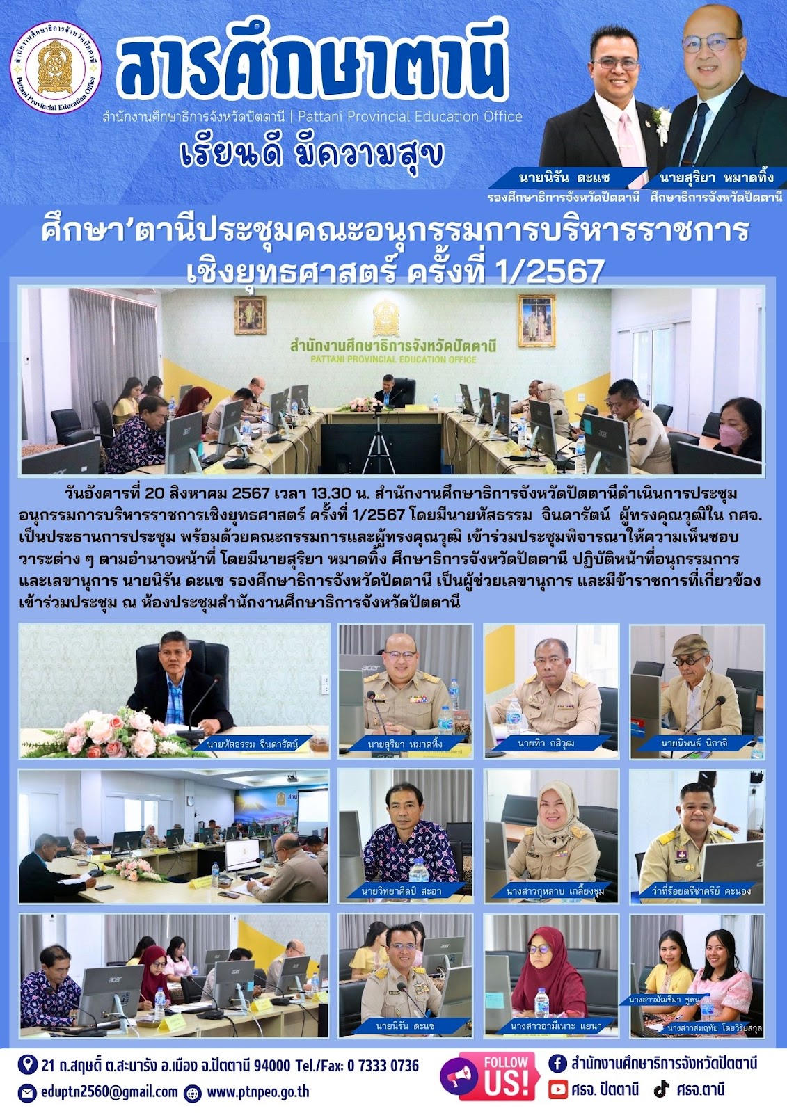 ศึกษา’ตานี ประชุมคณะอนุกรรมการบริหารราชการเชิงยุทธศาสตร์ ครั้งที่ 1/2567 ข่าวกิจกรรมกลุ่มงาน 21 ส.ค. 2567 321 share tweet share tags: กลุ่มนโยบายและแผน QR Code หน้านี้ : เรื่องที่เกี่ยวข้อง ข้อมูลสารสนเทศ ข้อมูลสารสนเทศด้านการศึกษาจังหวัดปัตตานี ปีการศึกษา 2568 เอกสารเผยแพร่ รายงานผลการดำเนินงาน ตามแผนปฏิบัติราชการ ประจำปีงบประมาณ พ.ศ. 2568 เอกสารเผยแพร่ แผนพัฒนาการศึกษาจังหวัดปัตตานี (ฉบับทบทวน พ.ศ. 2569 – 2573) ข่าวประชาสัมพันธ์ การสำรวจความคิดเห็นของประชาชนในการยกร่างแผนพัฒนาเศรษฐกิจและสังคมแห่งชาติ ฉบับที่ 14 (พ.ศ. 2571 – 2575) เอกสารเผยแพร่ การเปิดโอกาสให้เกิดการมีส่วนร่วม ปีงบประมาณ พ.ศ. 2568 เอกสารเผยแพร่ แผนปฏิบัติราชการประจำปีงบประมาณ พ.ศ. 2568 ของสำนักงานศึกษาธิการจังหวัดปัตตานี
