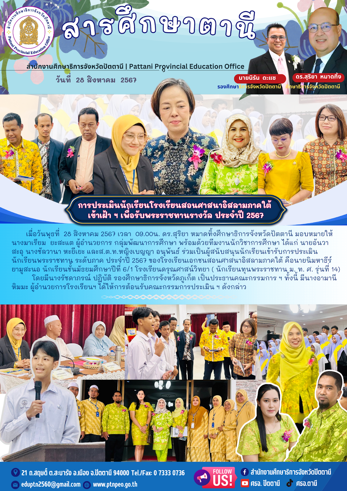 การประเมินนักเรียนโรงเรียนสอนศาสนาอิสลามภาคใต้ เข้าเฝ้าฯ เพื่อรับพระราชทานรางวัล ประจำปี 2567 ข่าวกิจกรรมกลุ่มงาน 28 ส.ค. 2024 495 share tweet share tags: กลุ่มพัฒนาการศึกษา เรื่องที่เกี่ยวข้อง กิจกรรมผู้บริหาร การประชุมคณะกรรมการขับเคลื่อน “Pattani Zero Dropout” มุ่งแก้ปัญหาเด็กและเยาวชนนอกระบบการศึกษาให้เป็นศูนย์อย่างยั่งยืน ข่าวกิจกรรมกลุ่มงาน พิธีมอบรางวัลเชิดชูเกียรติผู้ชนะ การประกวดคลิปสั้น ระดับจังหวัด ภายใต้แนวคิด “Hug Your Dream; Light Up Your Life.” ข่าวประชาสัมพันธ์ ขอเชิญชวนร่วมกิจกรรมประกวดสื่อสร้างเสน่ห์ไทย ข่าวประชาสัมพันธ์ ขอเชิญชวนร่วมกิจกรรม การประกวดเยาวชนต้นแบบด้านมารยาทไทยและมารยาทในสังคม ปี 2568 ข่าวกิจกรรมกลุ่มงาน ประชุม วางแผน คณะกรรมการดำเนินงานการจัดงานฉลองวันเด็กแห่งชาติ ประจำปี 2568 ข่าวกิจกรรมกลุ่มงาน ประกาศรายชื่อผู้ได้รับรับทุนปีการศึกษา 2566 ครั้งที่ 8 และปีการศึกษา 2567 ครั้งที่ 3
