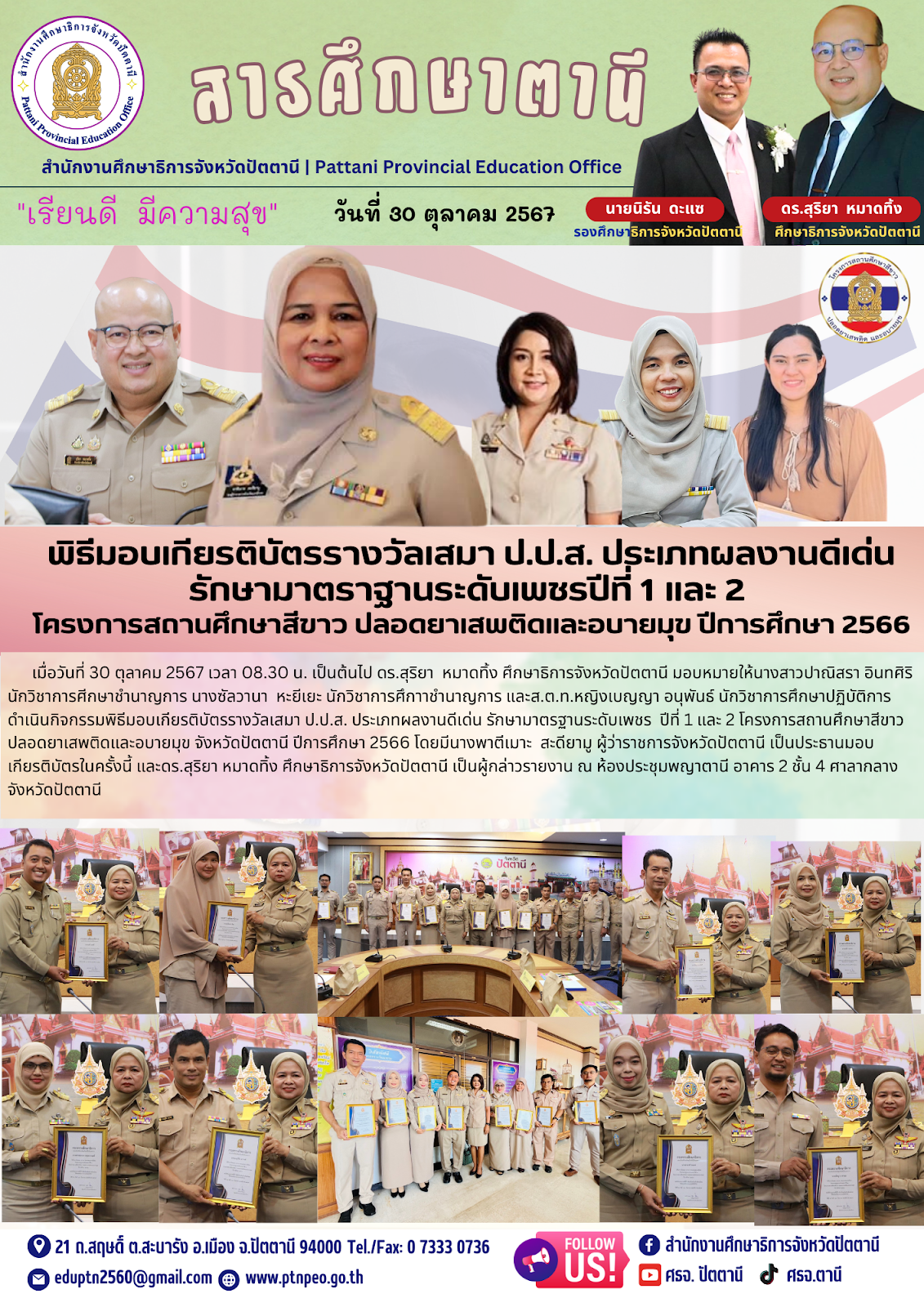 พิธีมอบเกียรติบัตรรางวัลเสมา ป.ป.ส. ประเภทผลงานดีเด่นรักษามาตราฐานระดับเพชรปีที่ 1 และ 2 โครงการสถานศึกษาสีขาว ปลอดยาเสพติดและอบายมุข ปีการศึกษา 2566 ข่าวกิจกรรมกลุ่มงาน 30 ต.ค. 2567 704 share tweet share tags: กลุ่มพัฒนาการศึกษา QR Code หน้านี้ : เรื่องที่เกี่ยวข้อง ข่าวกิจกรรมกลุ่มงาน พิธีมอบรางวัลเชิดชูเกียรติผู้ชนะ การประกวดคลิปสั้น ระดับจังหวัด ภายใต้แนวคิด “Hug Your Dream; Light Up Your Life.” ข่าวประชาสัมพันธ์ ขอเชิญชวนร่วมกิจกรรมประกวดสื่อสร้างเสน่ห์ไทย ข่าวประชาสัมพันธ์ ขอเชิญชวนร่วมกิจกรรม การประกวดเยาวชนต้นแบบด้านมารยาทไทยและมารยาทในสังคม ปี 2568 ข่าวกิจกรรมกลุ่มงาน ประชุม วางแผน คณะกรรมการดำเนินงานการจัดงานฉลองวันเด็กแห่งชาติ ประจำปี 2568 ข่าวกิจกรรมกลุ่มงาน ประกาศรายชื่อผู้ได้รับรับทุนปีการศึกษา 2566 ครั้งที่ 8 และปีการศึกษา 2567 ครั้งที่ 3 ข่าวกิจกรรมกลุ่มงาน ประชุมคณะกรรมการศูนย์อำนวยการป้องกันและปราบปรามยาเสพติดจังหวัดปัตตานี ครั้งที่ 4/2567